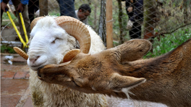Oh look, it’s Rick Santorum’s worst nightmare. Changmao the ram and Chunzi the doe are engaging in some sheep-on-deer marriage at China’s Yunnan Provincial Wildlife Park today, because true love knows no species, especially when you’re both even-toed ungulates who are too dumb to understand taxonomy.