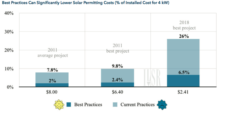 Fortunately, the Solar America Board of Codes and Standards has already developed a set of best practices that may significantly reduce the cost of permitting for solar projects. Their exhaustive list of strategies (such as expedited review based on a checklist, email rather than in-person permit submission, etc) can reduce permitting costs by 75%, giving a very different picture.