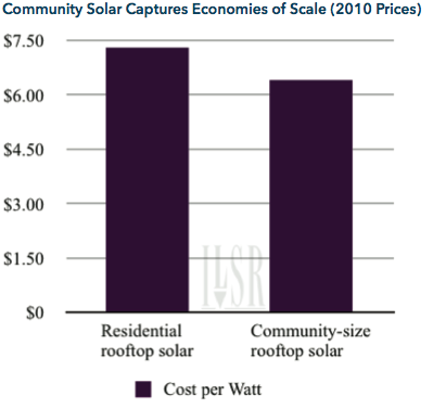 Community net metering is simply an accounting measure, but it can provide a way for many people to share the electricity output from a single solar array in their community, and make centrally located community solar projects possible. In addition to opening the door to solar for folks without suitable rooftops, by allowing people to share larger solar arrays it can also modestly reduce the cost of going solar. The following chart illustrates the economies of scale of solar power installed in the U.S. To use the example of a church roof-top array, it’s possible to see the cost savings from sharing a 30 kW array with a typical cost of $6.50 per Watt compared to 10 individual 3 kW arrays at $7.30 per Watt.6