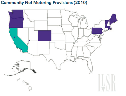 One policy solution to this net metering limitation is generically called community solar. At its simplest, community solar policy means “community net metering.” This policy, adopted by seven states and a number of individual utilities as of 2010, allows customers to build a common solar panel array and share the output via net metering on their individual bill. For example, the electricity from a 30 kW solar array on a nearby church could be shared among ten local owners, each receiving a share of the electricity output in proportion to their ownership share. The accounting is identical to net metering, minus the on-site solar. Customers still cannot get credit for significantly more solar electricity than they consume, but they do not need to have a sunny rooftop.