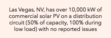 - Las Vegas, NV, has over 10,000 kW of commercial solar PV on a distribution circuit (50% of capacity, 100% during low load) with no reported issues