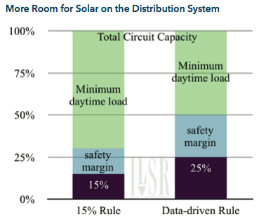 Raising the threshold seems reasonable because potential impacts of high distributed generation penetration (such as maintaining a constant voltage on the grid) have not proven out.2 In particular, there are several illustrations of the ability of the distribution grid to handle very high portions of solar PV generation, much more than the 15% rule.3