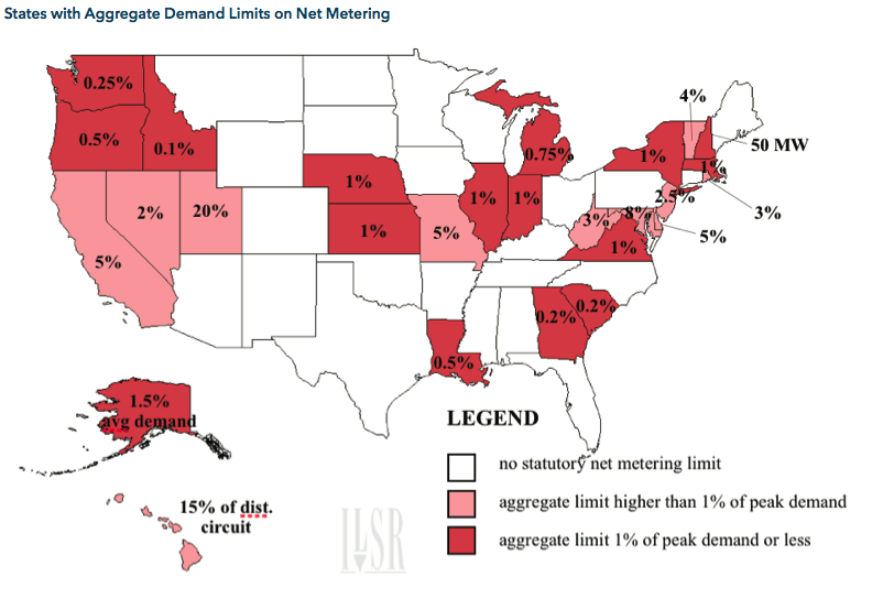 Another drawback of net metering is that it is often limited on a system-wide basis in many states, to a certain percentage of a utility’s load or peak load. California, for example, requires utilities to accept up to 5% of their peak demand from net metering, but no more.8 Most states limit net metering to 1% of a utility’s peak demand or less. The following map shows states with an aggregate net metering limit.9 States in dark red have limits 1% or less and states in light red have limits that are higher. States with no color have no statutory limit on net metered systems.