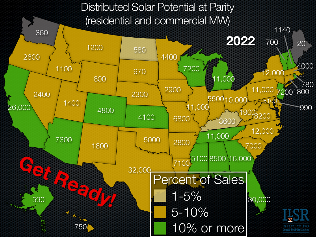 Regardless of their predisposition toward solar power, utilities, regulators, and policy makers need to recognize that there’s a revolution in electricity systems coming soon. Solar will become so affordable in the next 5-10 years that as many as 38 million homes and businesses will elect to produce their own power more cheaply from unsubsidized solar rather than buy it from their utility. That means policies that limit distributed generation will have to change: net metering limits must rise, permitting must be simplified, archaic “15% rules” will have to be driven by data not speculation.