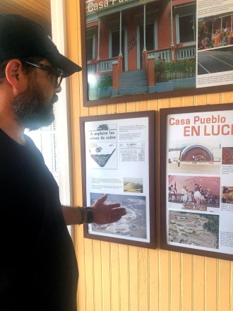 Arturo Massol-Deyá, executive director of Casa Pueblo, describes pictures portraying some of the organization’s early actions against open-pit mining. He has called for an ‘energy insurrection’ on the island. Grist / Paola Rosa-Aquino