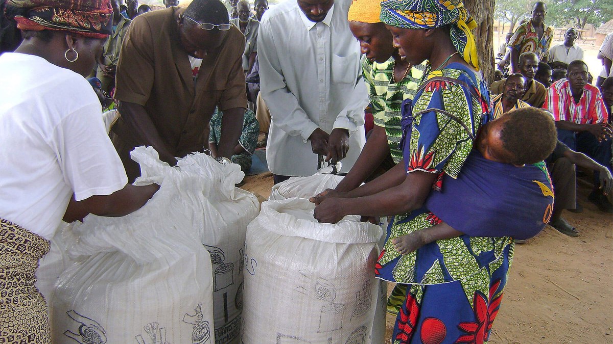 Purdue Improved Crop Storage bags are opened during a ceremony in Pala, Chad. The hermetic grain storage bags have allowed farmers in Africa to safely store their grains so they can sell their crop well beyond harvest. Purdue Agricultural Communication photo / Beksoubo Damienne
