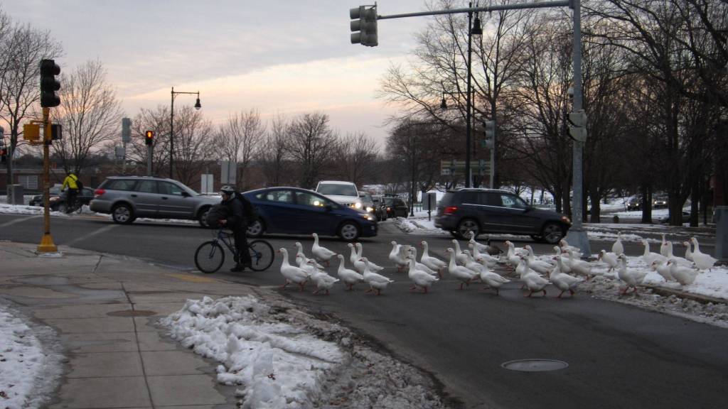 In Cambridge, Mass., a flock of geese were trying to cross the road.