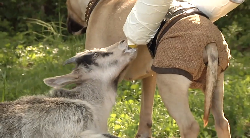 Watch a bull terrier nurse cute baby goats using special milk pants