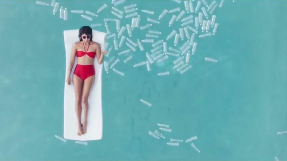 This ad makes fun of throw-away culture with a fake water bottle brand called "Once."