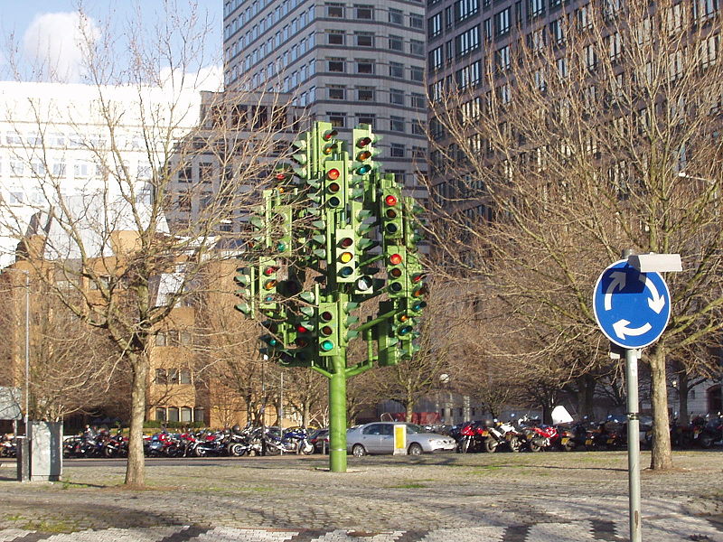 It's a traffic light! It's a piece of public art! It stands where a tree used to stand! It makes us want to cry!
