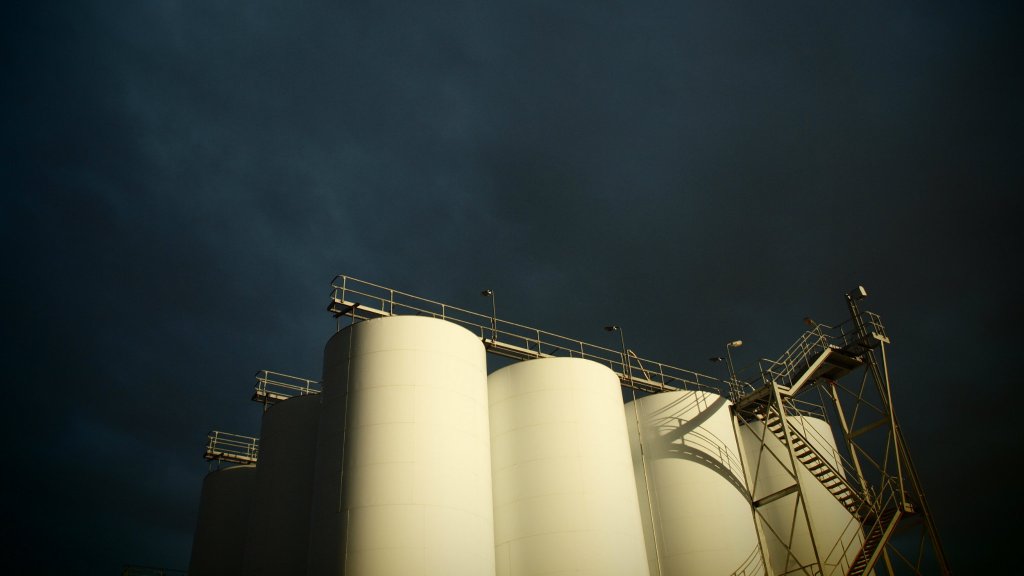 Parking on a hill overlooking the site, I gazed down at 60 or so squat white tanks, some of which had geodesic domes. Trucks rolled in and out, but no humans were visible on the ground. The place looked like a lunar self-storage facility.