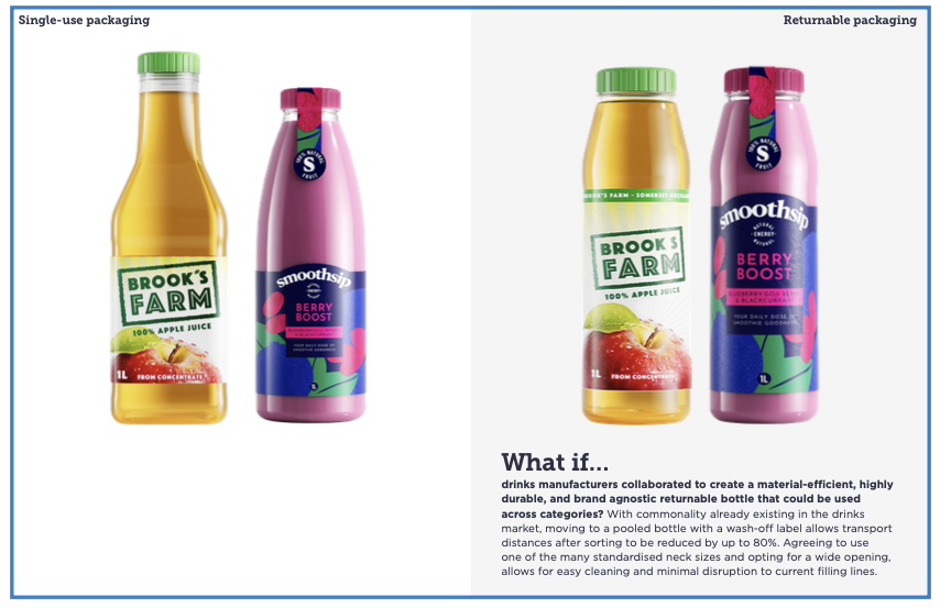 This flexible approach fits into a category that EMF calls “bespoke with shared standards,” where containers can vary from brand to brand while still sharing common characteristics — like where labels are placed, or the width of a bottle’s mouth. This leaves big brands free to design their own unique packaging if they want to.