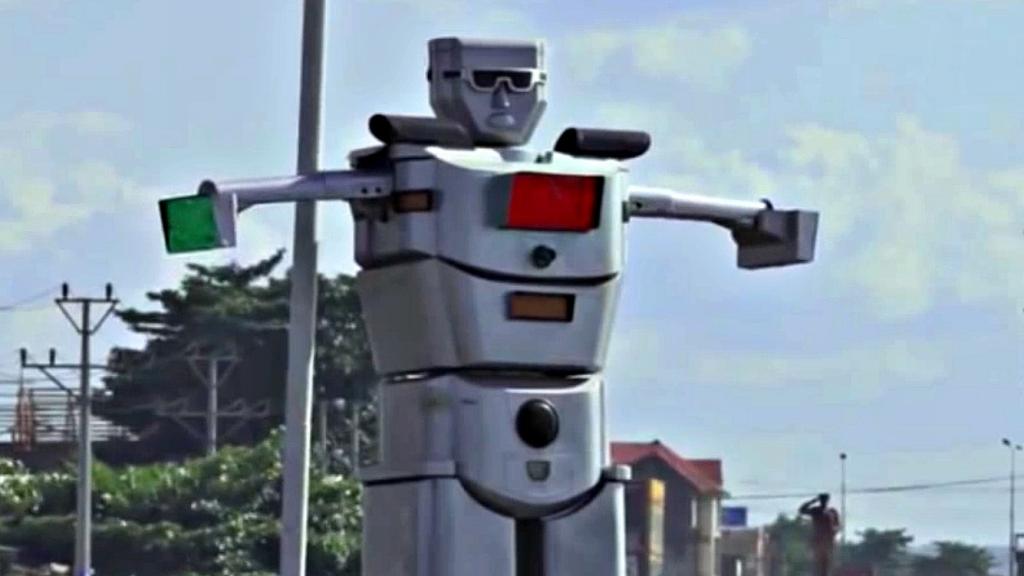 Giant solar-powered traffic-directing robot strikes fear into rude drivers’ hearts