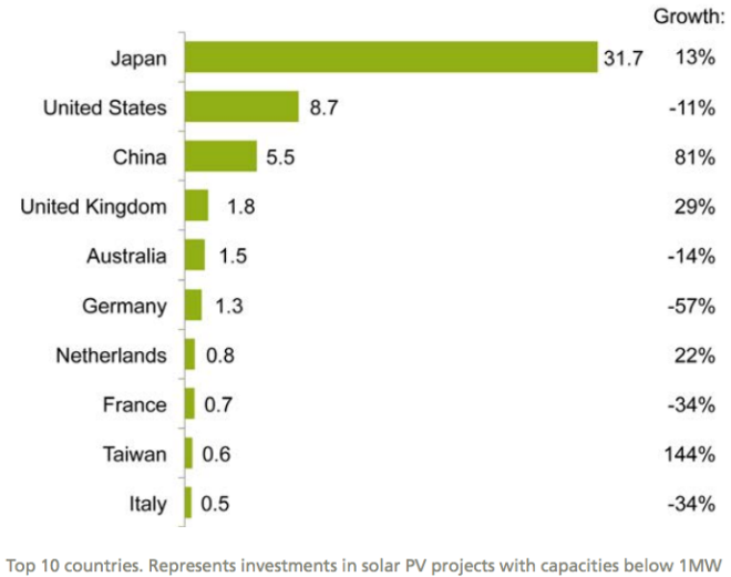 That’s not the whole story, though. While China experienced 81 percent growth last year in new small distributed capacity (solar projects with a capacity of less than 1 megawatt), Japan still smashed the rest of the world in that sector. In the bar graph below, note that even with declining investment in small distributed capacity, the U.S. still finished in second:
