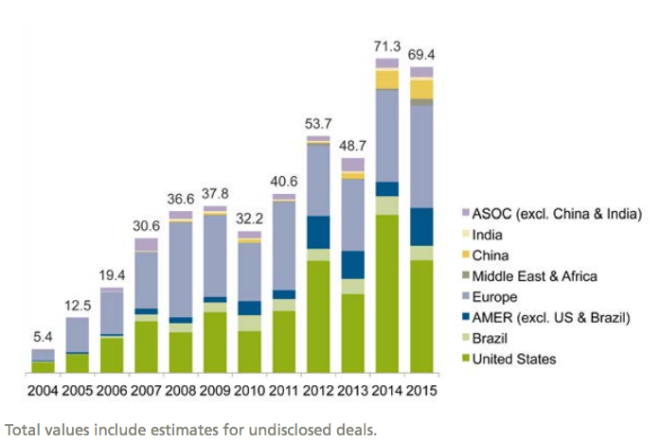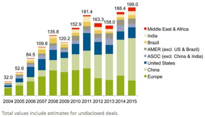 Asset acquisitions and refinancings by region, 2004–2015, $bnBloomberg New Energy Finance