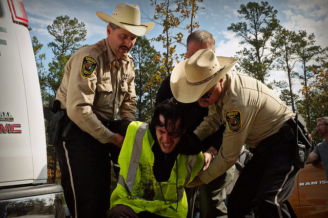 More than 100 activists intent on shutting down construction of TransCanada’s Keystone XL pipeline again gathered in the small East Texas town of Nacogdoches, again constructed treesits, again chained themselves to TransCanada’s equipment, and again were brutalized and arrested for their efforts. (We reported on a previous day of action last month.)