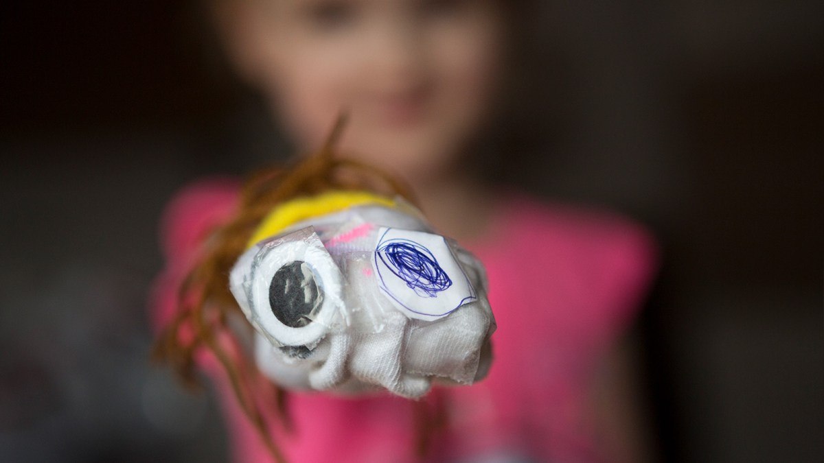 - Slip your arm into the bag or sock to locate the best place for your puppet’s face, marking eyes, nose, and other features with a pencil.