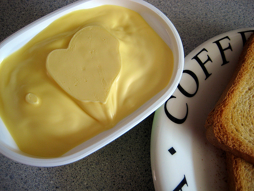 | Hm. What else can you do? For spreads, how about skipping the “butter” altogether and upping the yumminess factor with good old olive oil, avocado, hummus, almond butter, or peanut butter (watch out for palm oil in some nut butters, though). For baking, you can use various vegetable oils as substitutes, or coconut oil. I am no shill for Earth Balance, but they have a coconut spread [PDF] that’s purportedly good for eating and baking. I hear tell that another good option is prune puree. (Note to self: possible stage name.) |