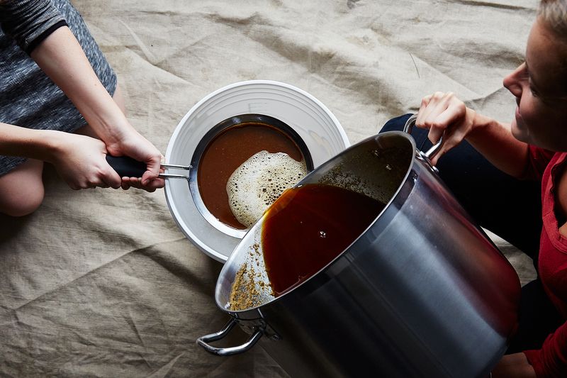 Step 14: Pour your cooled wort through a sanitized strainer into the sanitized fermenter (having a buddy helps for this!). Food52 / Bobbi Lin