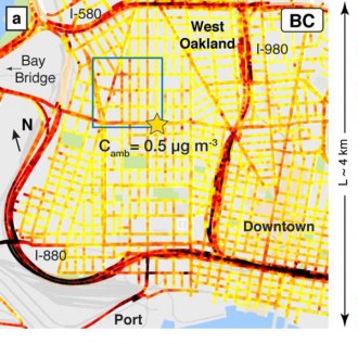 A study mapped the prevalence of black carbon in the air around the Port of Oakland. The highest concentrations, denoted in black, are at the interface between the port and the community of West Oakland. American Chemical Society