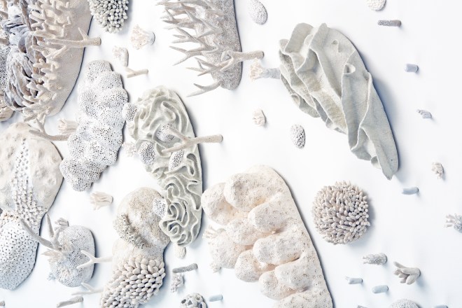 A. Well I listen to a lot of podcasts; I burn through audiobooks really fast [laughs] … I hand-build everything — I don’t use molds. I built it all in my studio in Denver; I call it my “inland sea studio.” I build a lot of the delicate things, like the tentacles and cup corals, out of porcelain. For the bulkier pieces, I use stoneware sculpture, made of a clay body. The process is two different firings, using a glaze to form a skin over the ceramic structures. It feels like the chemistry of my work parallels the skeletons of reef-building corals. And a lot of them are equally fragile to real corals — I kind of do that on purpose, even though it scares curators. But it’s more realistic — when you dive on a real coral reef, everything is so fragile.
