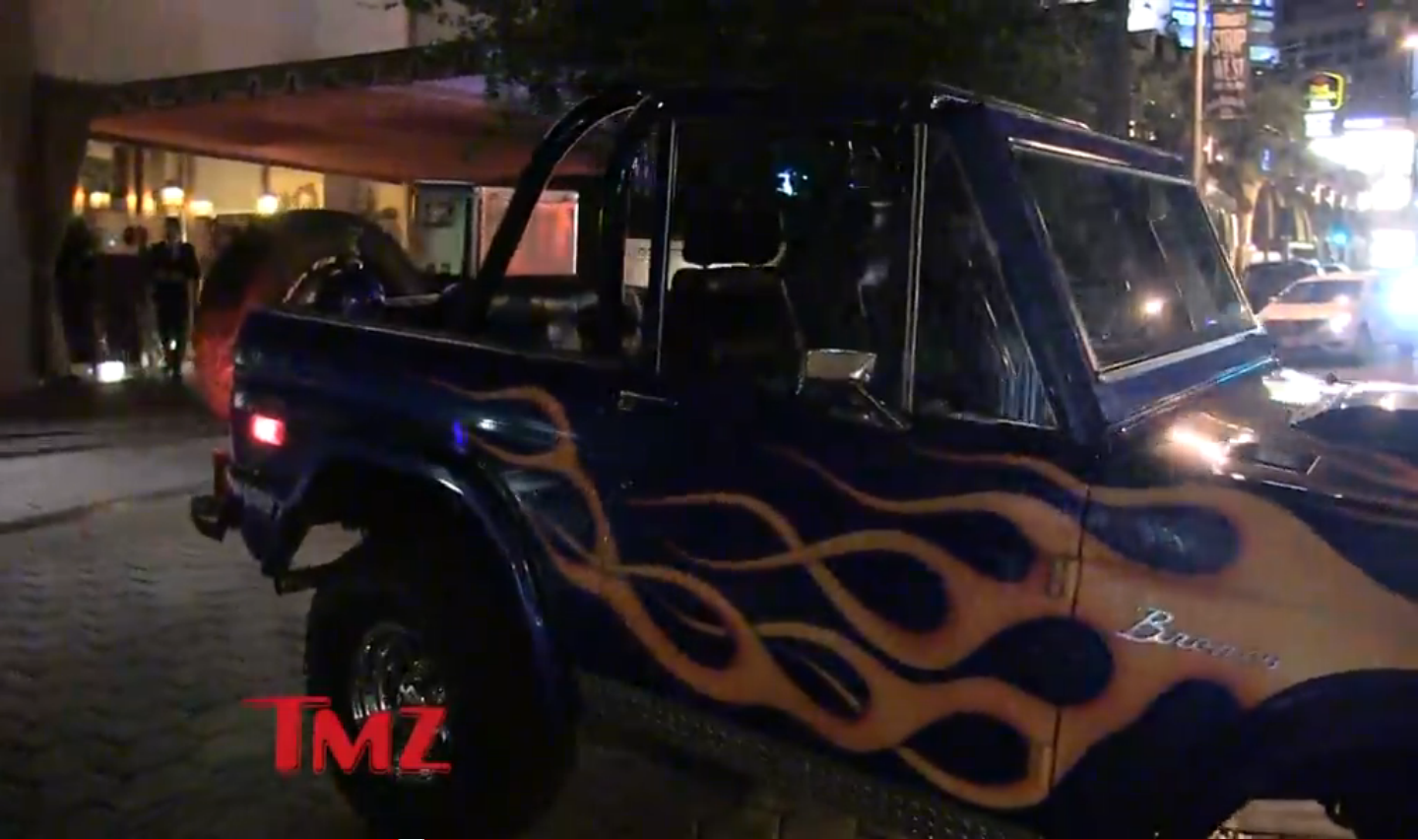 Jared Leto drives a very sick 1977 (THIS YEAR IS AN EDUCATED GUESS BASED ON A BRIEF PERUSAL OF GOOGLE IMAGES) Ford Bronco that is painted in flames. Extremely sick flames.