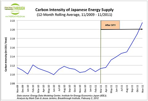 According to a new report from the Breakthrough Institute (which is generally skeptical of energy efficiency and cool with nuclear power), Japan produced 4 percent more carbon dioxide this November than last, and the overall carbon intensity increased, as this graph shows:
