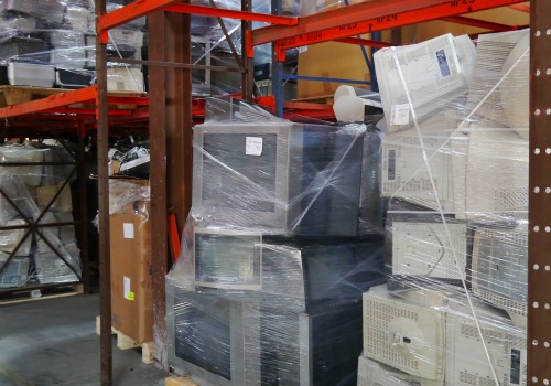 Broken electronics are baled together and covered in heavy-duty shrink wrap. The packages often weigh hundreds of pounds.